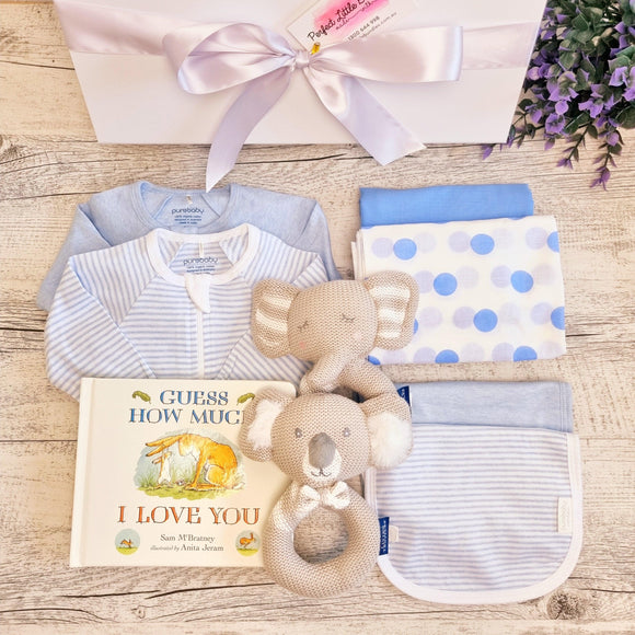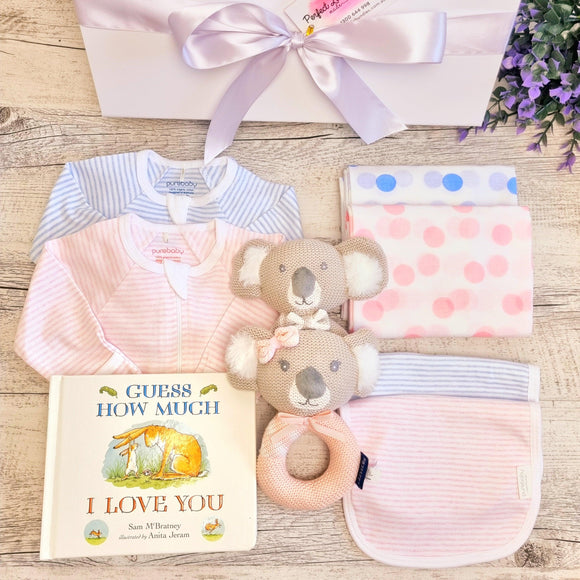 For parents blessed with both a baby girl and a baby boy, the Double The Joy Twin Baby Girl and Boy Hamper is the perfect choice. This delightful gift includes Pure Baby organic cotton zip suits, cotton essentials bibs, Emotion & Kids cotton muslin wraps, a Guess How Much I Love You book, and koala knitted rattles to keep both babies entertained. With its thoughtful selection of gender-neutral items, this hamper is ideal for welcoming twin babies into the world.