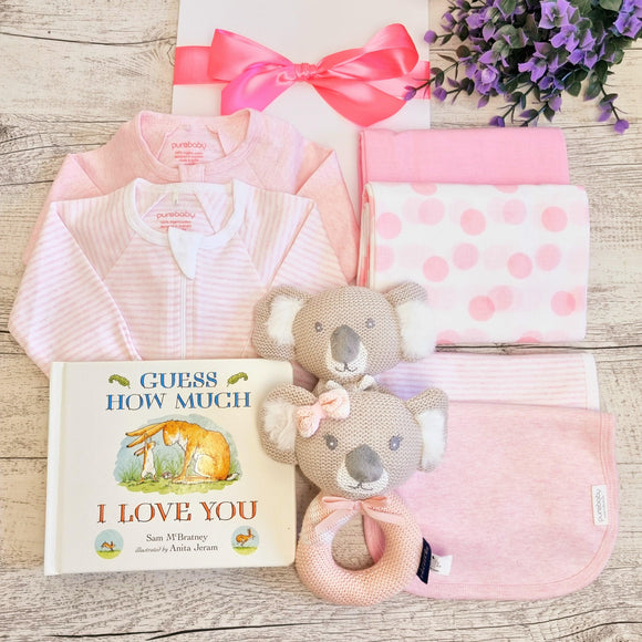 For parents blessed with twin baby girls, the Double The Joy Twin Baby Girls Hamper is the perfect choice. This delightful gift includes Pure Baby organic cotton zip suits, cotton essentials bibs, Emotion & Kids cotton muslin wraps, a Guess How Much I Love You book, and koala knitted rattles to keep both babies entertained. With its charming pink hues and cuddly designs, this hamper is sure to bring smiles to the faces of new parents of twin-baby girls.