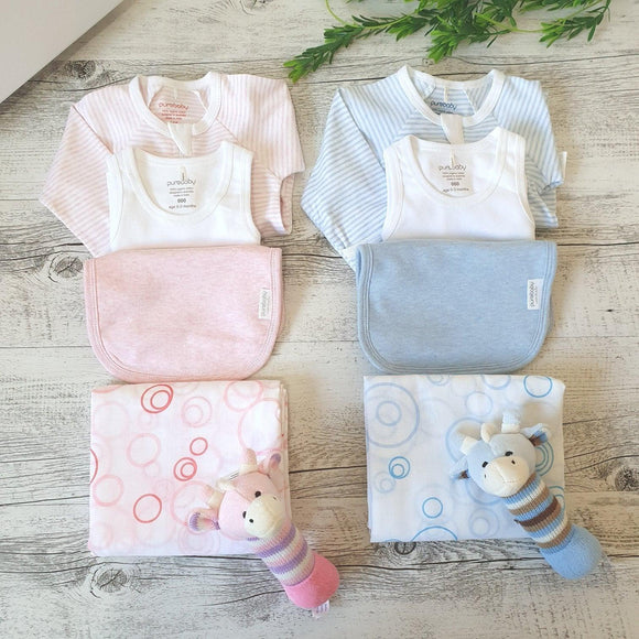 Perfect Little Bundles offers a unique One of Each Twin Baby Gift Hamper for parents expecting both a baby boy and a baby girl. This thoughtful gift includes Purebaby organic zip growsuits, organic singlets, cotton bibs, Emotion and Kids muslin wraps, and a giraffe squeaker to keep the babies entertained. With its combination of pink and blue hues and adorable giraffe motif, this hamper is the perfect choice for celebrating the arrival of boy-girl twins.