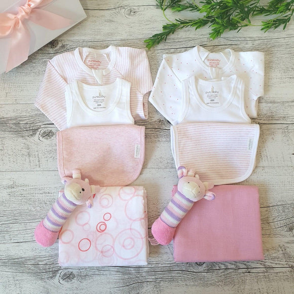Celebrate the arrival of twin baby girls with the Pretty Little Twin Baby Girls Hamper from Perfect Little Bundles. This charming gift includes everything new parents need to pamper their little princesses, including Purebaby growsuits, singlets, bibs, Emotion and Kids muslin wraps, and a giraffe squeaker to keep them entertained. With its soft cotton fabrics and delicate designs, this hamper is sure to delight any new parent of twin-baby girls.
