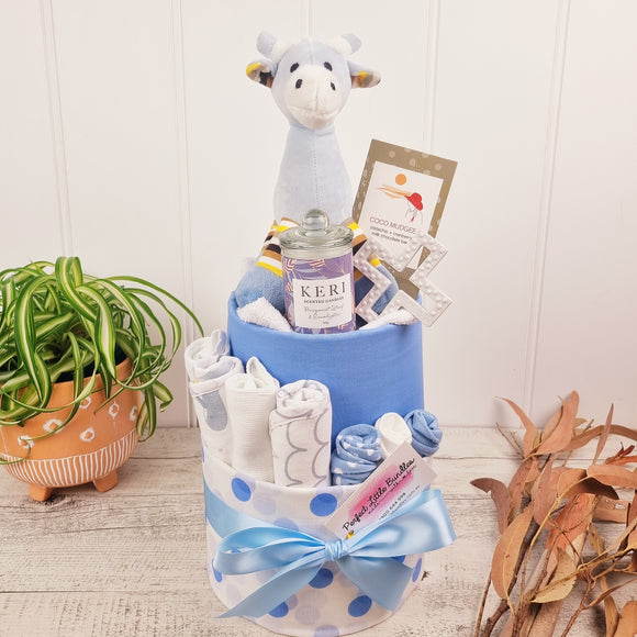 This premium nappy cake features a friendly Gerry Giraffe plush toy along with essential baby items, making it the perfect gift for a baby shower or a welcome gift for a baby boy. With singlets, bibs, muslin wraps, socks, and more included, this nappy cake provides everything new parents need to care for their little one, all wrapped up in a charming and practical package that's sure to bring joy to new parents and their little bundle of joy.
